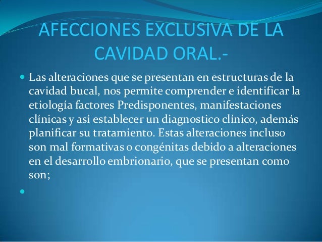 - 10. AFECCIONES EXCLUSIVA DE LA CAVIDAD ORAL.- ? Las alteraciones que se presentan en estructuras de la cavidad bucal, nos permite comprender e identificar la etiología factores Predisponentes, manifestaciones clínicas y así establecer un diagnostico clínico, además planificar su tratamiento. Estas alteraciones incluso son mal formativas o congénitas debido a alteraciones en el desarrollo embrionario, que se presentan como son; ?