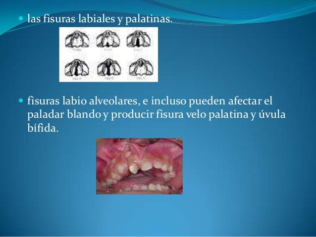 - 11. ? las fisuras labiales y palatinas. ? fisuras labio alveolares, e incluso pueden afectar el paladar blando y producir fisura velo palatina y úvula bífida.