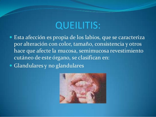 - 12. QUEILITIS: ? Esta afección es propia de los labios, que se caracteriza por alteración con color, tamaño, consistencia y otros hace que afecte la mucosa, semimucosa revestimiento cutáneo de este órgano, se clasifican en: ? Glandulares y no glandulares