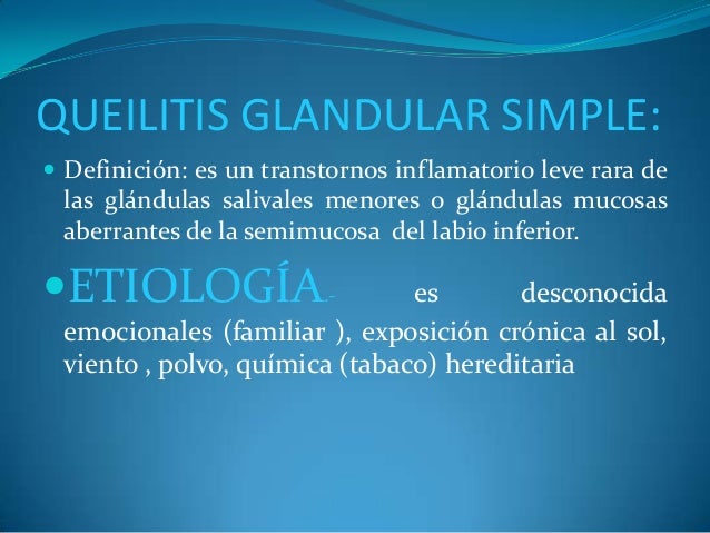 - 14. QUEILITIS GLANDULAR SIMPLE: ? Definición: es un transtornos inflamatorio leve rara de las glándulas salivales menores o glándulas mucosas aberrantes de la semimucosa del labio inferior. ?ETIOLOGÍA.- es desconocida emocionales (familiar ), exposición crónica al sol, viento , polvo, química (tabaco) hereditaria