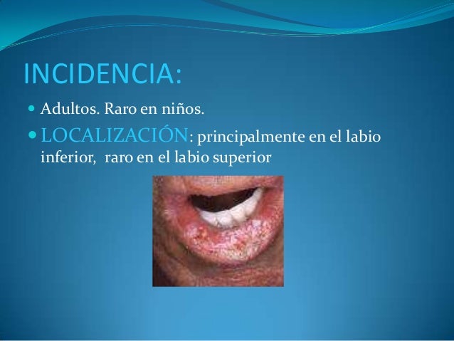 - 15. INCIDENCIA: ? Adultos. Raro en niños. ? LOCALIZACIÓN: principalmente en el labio inferior, raro en el labio superior