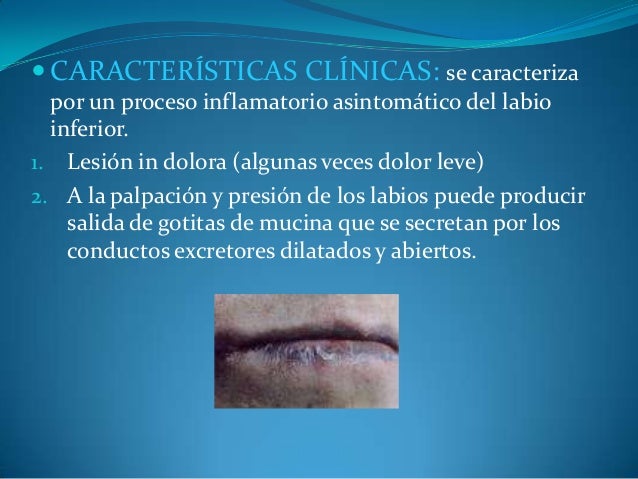 - 16. ? CARACTERÍSTICAS CLÍNICAS: se caracteriza por un proceso inflamatorio asintomático del labio inferior. 1. Lesión in dolora (algunas veces dolor leve) 2. A la palpación y presión de los labios puede producir salida de gotitas de mucina que se secretan por los conductos excretores dilatados y abiertos.