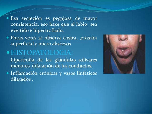 - 17. ? Esa secreción es pegajosa de mayor consistencia, eso hace que el labio sea evertido e hipertrofiado. ? Pocas veces se observa costra, ,erosión superficial y micro abscesos ?HISTOPATOLOGIA: hipertrofia de las glándulas salivares menores, dilatación de los conductos. ? Inflamación crónicas y vasos linfáticos dilatados .