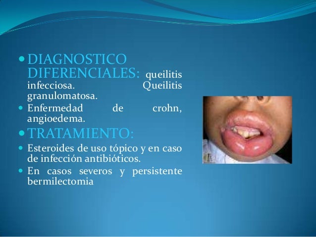 - 18. ?DIAGNOSTICO DIFERENCIALES: queilitis infecciosa. Queilitis granulomatosa. ? Enfermedad de crohn, angioedema. ?TRATAMIENTO: ? Esteroides de uso tópico y en caso de infección antibióticos. ? En casos severos y persistente bermilectomia