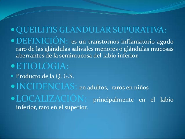 - 19. ?QUEILITIS GLANDULAR SUPURATIVA: ?DEFINICIÓN: es un transtornos inflamatorio agudo raro de las glándulas salivales menores o glándulas mucosas aberrantes de la semimucosa del labio inferior. ?ETIOLOGIA: ? Producto de la Q. G.S. ?INCIDENCIAS: en adultos, raros en niños ?LOCALIZACIÓN: principalmente en el labio inferior, raro en el superior.
