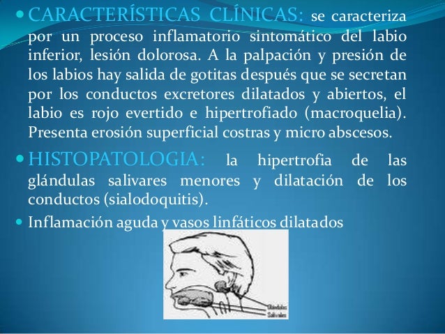 - 20. ? CARACTERÍSTICAS CLÍNICAS: se caracteriza por un proceso inflamatorio sintomático del labio inferior, lesión dolorosa. A la palpación y presión de los labios hay salida de gotitas después que se secretan por los conductos excretores dilatados y abiertos, el labio es rojo evertido e hipertrofiado (macroquelia). Presenta erosión superficial costras y micro abscesos. ? HISTOPATOLOGIA: la hipertrofia de las glándulas salivares menores y dilatación de los conductos (sialodoquitis). ? Inflamación aguda y vasos linfáticos dilatados