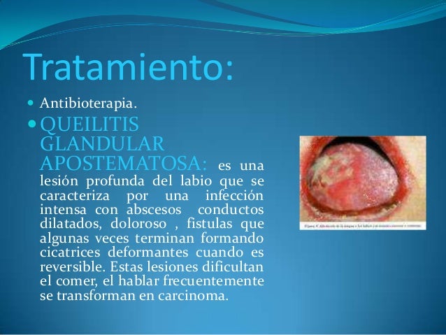 - 21. Tratamiento: ? Antibioterapia. ?QUEILITIS GLANDULAR APOSTEMATOSA: es una lesión profunda del labio que se caracteriza por una infección intensa con abscesos conductos dilatados, doloroso , fistulas que algunas veces terminan formando cicatrices deformantes cuando es reversible. Estas lesiones dificultan el comer, el hablar frecuentemente se transforman en carcinoma.