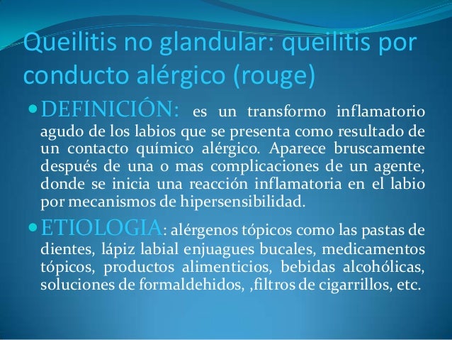 - 22. Queilitis no glandular: queilitis por conducto alérgico (rouge) ?DEFINICIÓN: es un transformo inflamatorio agudo de los labios que se presenta como resultado de un contacto químico alérgico. Aparece bruscamente después de una o mas complicaciones de un agente, donde se inicia una reacción inflamatoria en el labio por mecanismos de hipersensibilidad. ?ETIOLOGIA: alérgenos tópicos como las pastas de dientes, lápiz labial enjuagues bucales, medicamentos tópicos, productos alimenticios, bebidas alcohólicas, soluciones de formaldehidos, ,filtros de cigarrillos, etc.