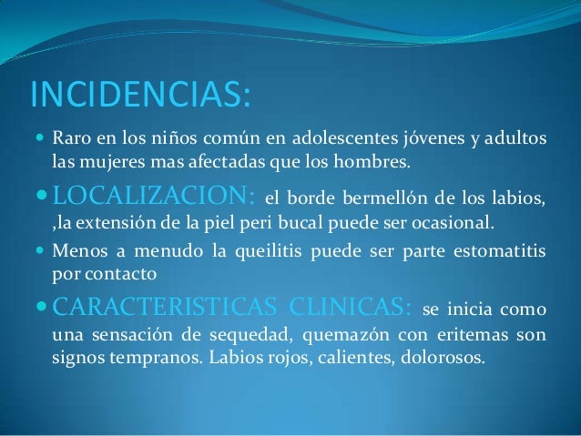 - 23. INCIDENCIAS: ? Raro en los niños común en adolescentes jóvenes y adultos las mujeres mas afectadas que los hombres. ?LOCALIZACION: el borde bermellón de los labios, ,la extensión de la piel peri bucal puede ser ocasional. ? Menos a menudo la queilitis puede ser parte estomatitis por contacto ? CARACTERISTICAS CLINICAS: se inicia como una sensación de sequedad, quemazón con eritemas son signos tempranos. Labios rojos, calientes, dolorosos.