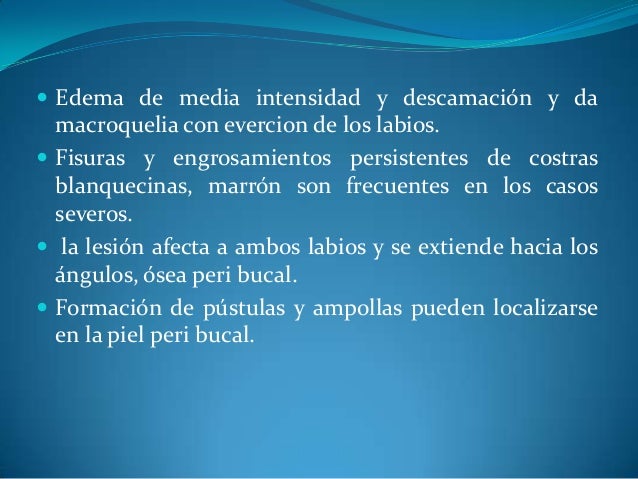 - 24. ? Edema de media intensidad y descamación y da macroquelia con evercion de los labios. ? Fisuras y engrosamientos persistentes de costras blanquecinas, marrón son frecuentes en los casos severos. ? la lesión afecta a ambos labios y se extiende hacia los ángulos, ósea peri bucal. ? Formación de pústulas y ampollas pueden localizarse en la piel peri bucal.