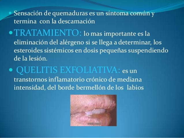 - 25. ? Sensación de quemaduras es un síntoma común y termina con la descamación ?TRATAMIENTO: lo mas importante es la eliminación del alérgeno si se llega a determinar, los esteroides sistémicos en dosis pequeñas suspendiendo de la lesión. ? QUELITIS EXFOLIATIVA: es un transtornos inflamatorio crónico de mediana intensidad, del borde bermellón de los labios