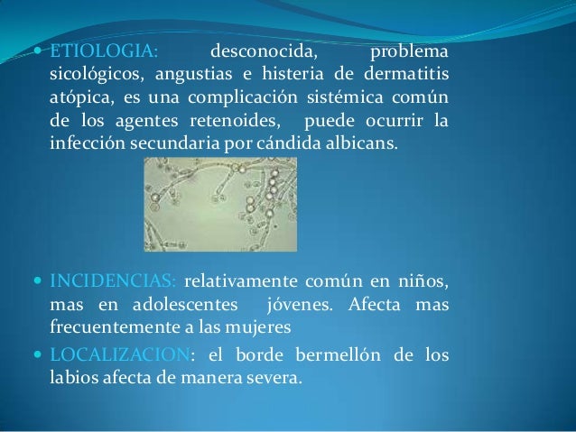 - 26. ? ETIOLOGIA: desconocida, problema sicológicos, angustias e histeria de dermatitis atópica, es una complicación sistémica común de los agentes retenoides, puede ocurrir la infección secundaria por cándida albicans. ? INCIDENCIAS: relativamente común en niños, mas en adolescentes jóvenes. Afecta mas frecuentemente a las mujeres ? LOCALIZACION: el borde bermellón de los labios afecta de manera severa.