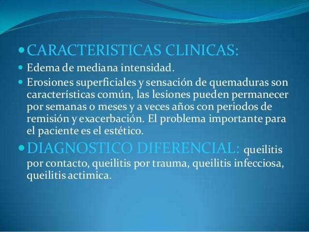 - 27. ?CARACTERISTICAS CLINICAS: ? Edema de mediana intensidad. ? Erosiones superficiales y sensación de quemaduras son características común, las lesiones pueden permanecer por semanas o meses y a veces años con periodos de remisión y exacerbación. El problema importante para el paciente es el estético. ?DIAGNOSTICO DIFERENCIAL: queilitis por contacto, queilitis por trauma, queilitis infecciosa, queilitis actimica.