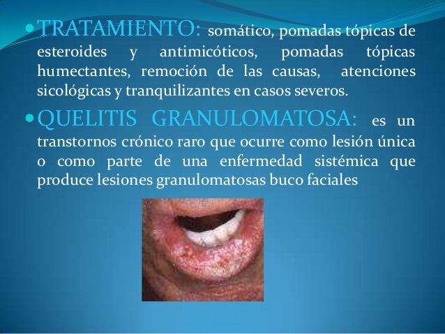 - 28. ?TRATAMIENTO: somático, pomadas tópicas de esteroides y antimicóticos, pomadas tópicas humectantes, remoción de las causas, atenciones sicológicas y tranquilizantes en casos severos. ?QUELITIS GRANULOMATOSA: es un transtornos crónico raro que ocurre como lesión única o como parte de una enfermedad sistémica que produce lesiones granulomatosas buco faciales
