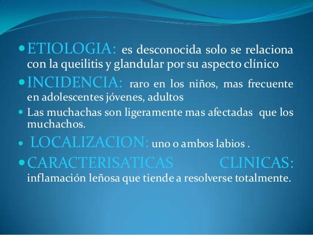- 29. ?ETIOLOGIA: es desconocida solo se relaciona con la queilitis y glandular por su aspecto clínico ?INCIDENCIA: raro en los niños, mas frecuente en adolescentes jóvenes, adultos ? Las muchachas son ligeramente mas afectadas que los muchachos. ? LOCALIZACION: uno o ambos labios . ?CARACTERISATICAS CLINICAS: inflamación leñosa que tiende a resolverse totalmente.