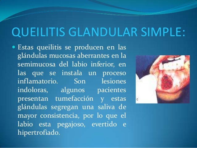 - 3. QUEILITIS GLANDULAR SIMPLE: ? Estas queilitis se producen en las glándulas mucosas aberrantes en la semimucosa del labio inferior, en las que se instala un proceso inflamatorio. Son lesiones indoloras, algunos pacientes presentan tumefacción y estas glándulas segregan una saliva de mayor consistencia, por lo que el labio esta pegajoso, evertido e hipertrofiado.