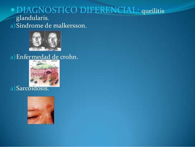 - 30. ?DIAGNOSTICO DIFERENCIAL: queilitis glandularis. a)Síndrome de malkersson. a)Enfermedad de crohn. a)Sarcoidosis.