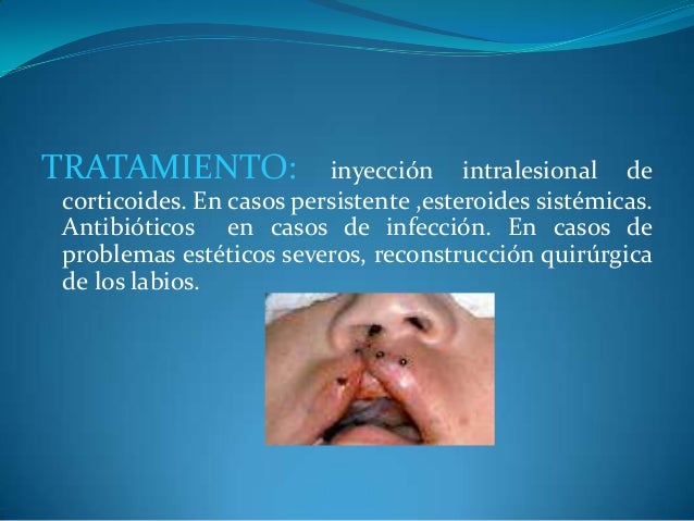 - 31. TRATAMIENTO: inyección intralesional de corticoides. En casos persistente ,esteroides sistémicas. Antibióticos en casos de infección. En casos de problemas estéticos severos, reconstrucción quirúrgica de los labios.