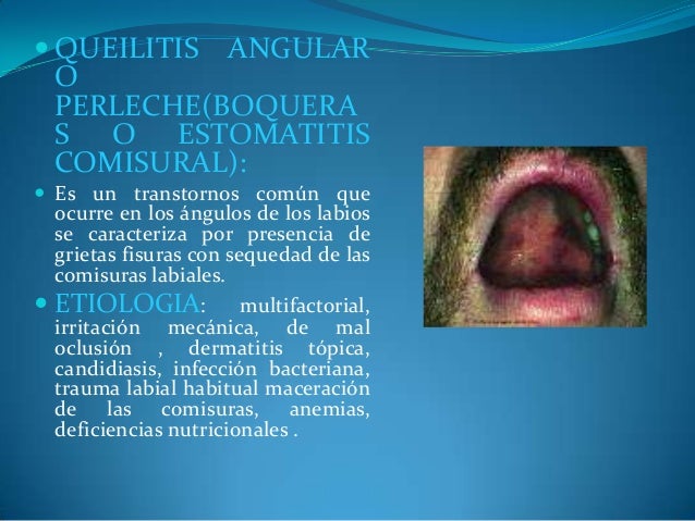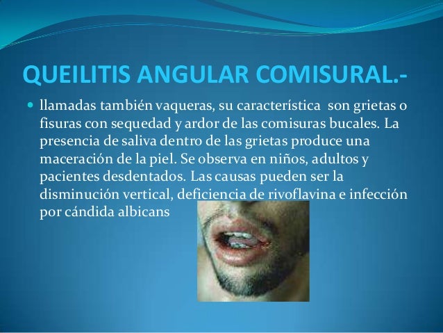 - 9. QUEILITIS ANGULAR COMISURAL.- ? llamadas también vaqueras, su característica son grietas o fisuras con sequedad y ardor de las comisuras bucales. La presencia de saliva dentro de las grietas produce una maceración de la piel. Se observa en niños, adultos y pacientes desdentados. Las causas pueden ser la disminución vertical, deficiencia de rivoflavina e infección por cándida albicans