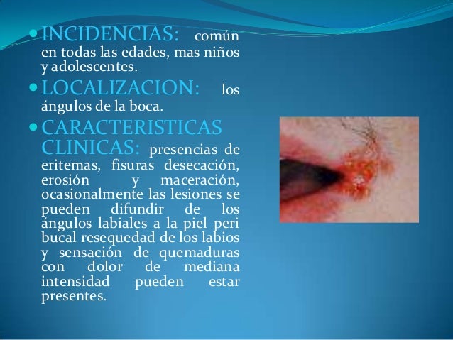 - 33. ?INCIDENCIAS: común en todas las edades, mas niños y adolescentes. ?LOCALIZACION: los ángulos de la boca. ?CARACTERISTICAS CLINICAS: presencias de eritemas, fisuras desecación, erosión y maceración, ocasionalmente las lesiones se pueden difundir de los ángulos labiales a la piel peri bucal resequedad de los labios y sensación de quemaduras con dolor de mediana intensidad pueden estar presentes.