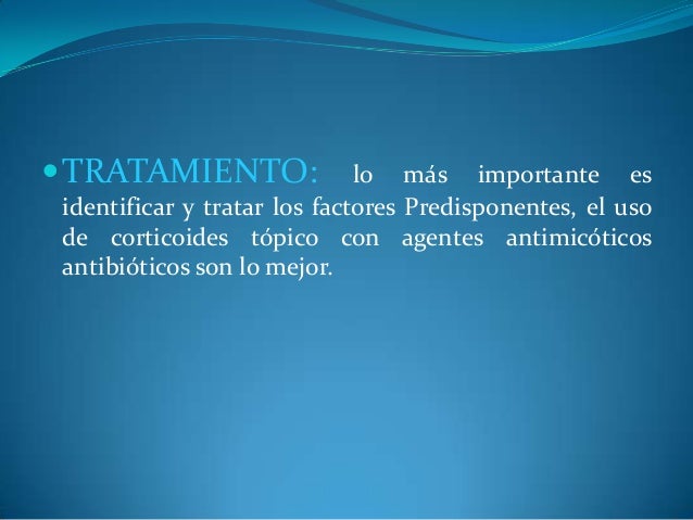- 34. ?TRATAMIENTO: lo más importante es identificar y tratar los factores Predisponentes, el uso de corticoides tópico con agentes antimicóticos antibióticos son lo mejor