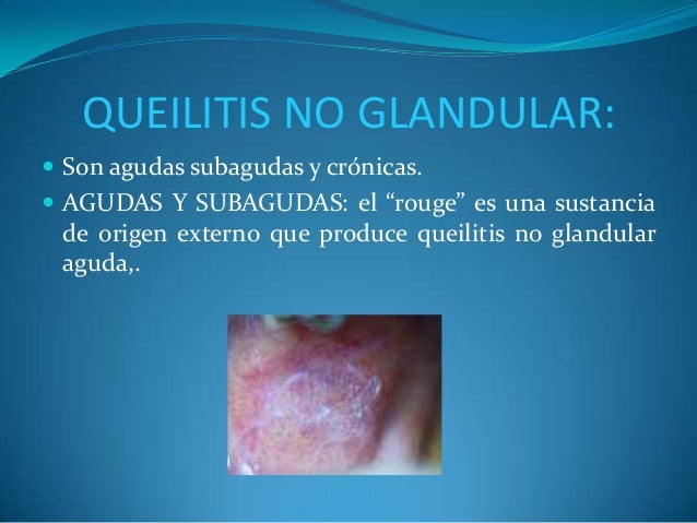 - 4. QUEILITIS NO GLANDULAR: ? Son agudas subagudas y crónicas. ? AGUDAS Y SUBAGUDAS: el “rouge” es una sustancia de origen externo que produce queilitis no glandular aguda,.