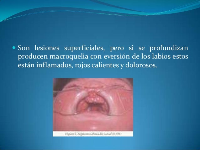 - 6. ? Son lesiones superficiales, pero si se profundizan producen macroquelia con eversión de los labios estos están inflamados, rojos calientes y dolorosos.