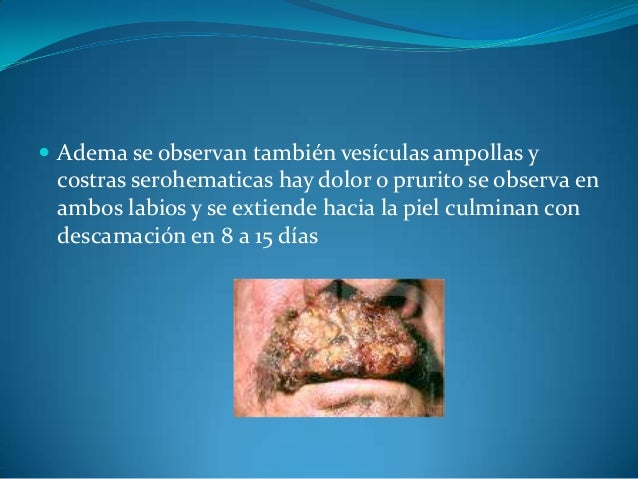 - 7. ? Adema se observan también vesículas ampollas y costras serohematicas hay dolor o prurito se observa en ambos labios y se extiende hacia la piel culminan con descamación en 8 a 15 días