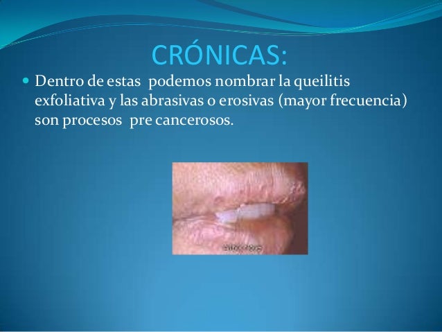 - 8. CRÓNICAS: ? Dentro de estas podemos nombrar la queilitis exfoliativa y las abrasivas o erosivas (mayor frecuencia) son procesos pre cancerosos.